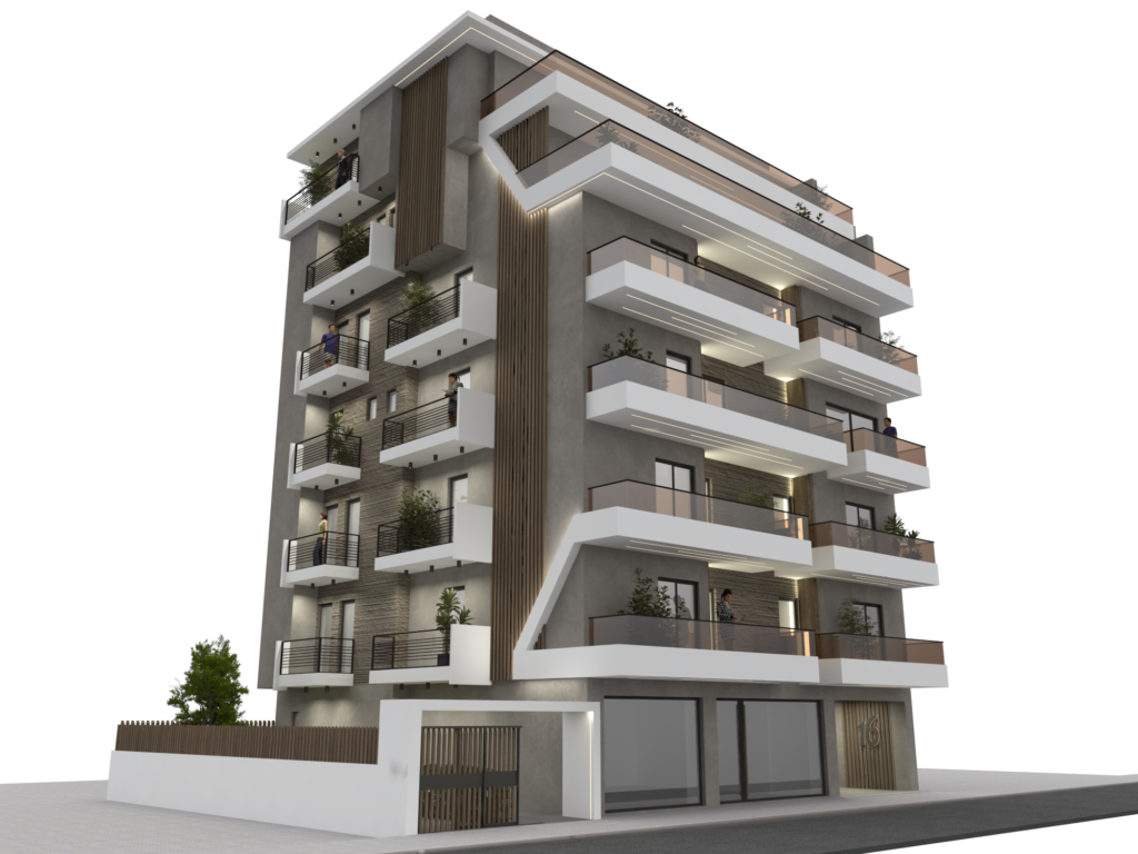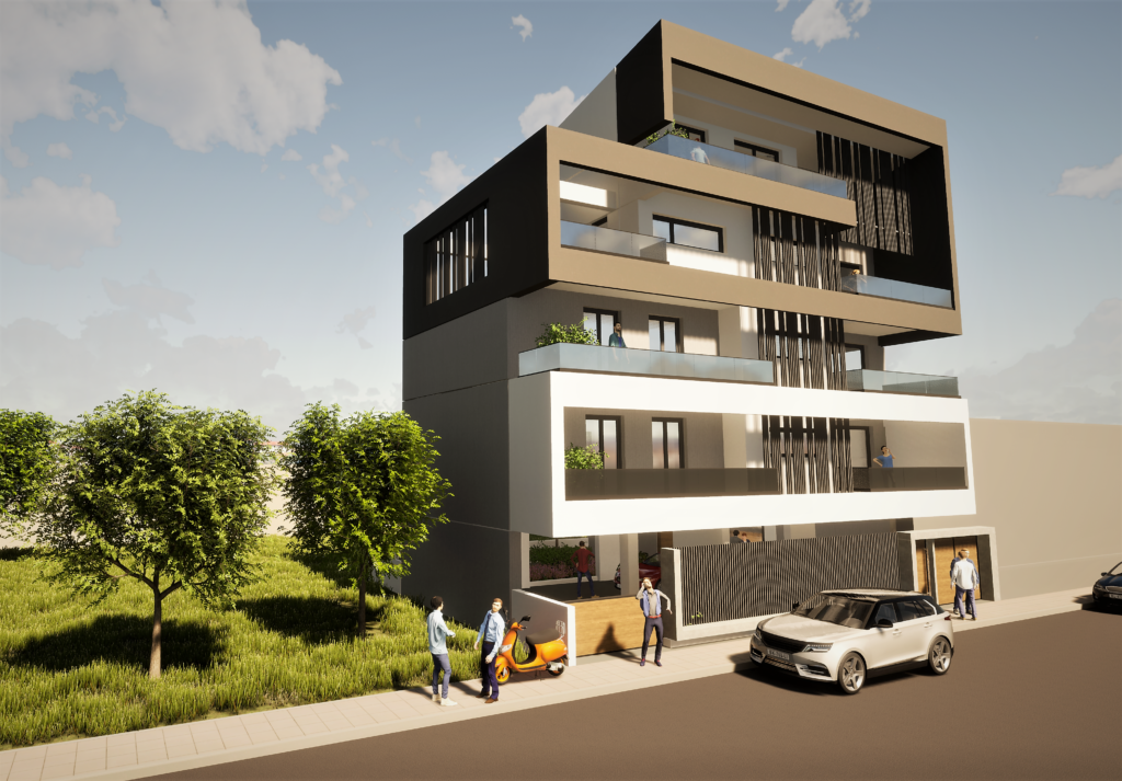 2 τετραώροφες οικοδομές επί πυλωτής, με υπόγειο και στέγη σοφίτα